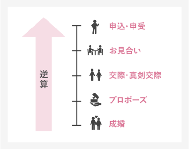 そして、目標から逆算して、お見合い回数や交際期間をシミュレーションしておくことが大切です。